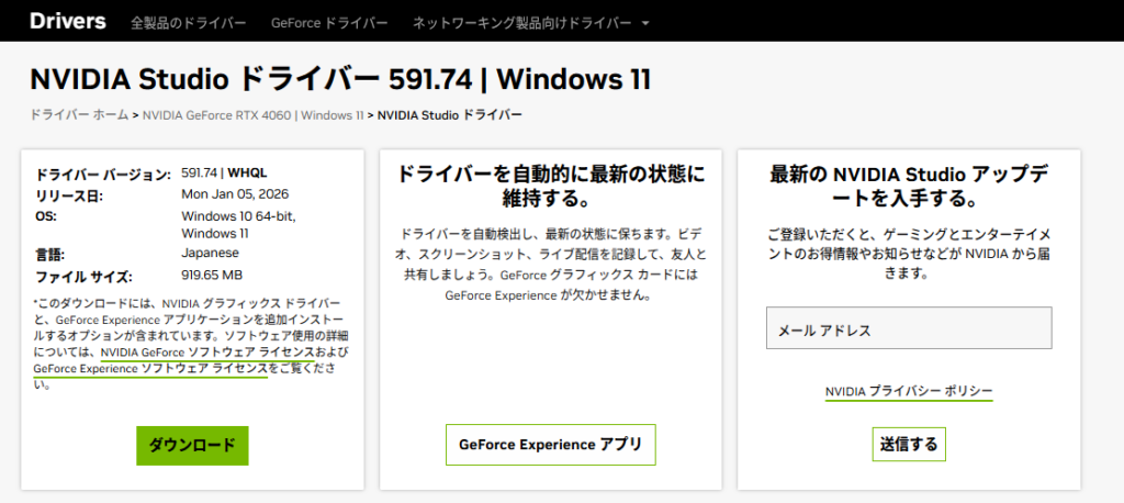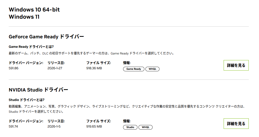 GeForce Game Ready ドライバー と NVIDIA Studio ドライバーの2種類がある。